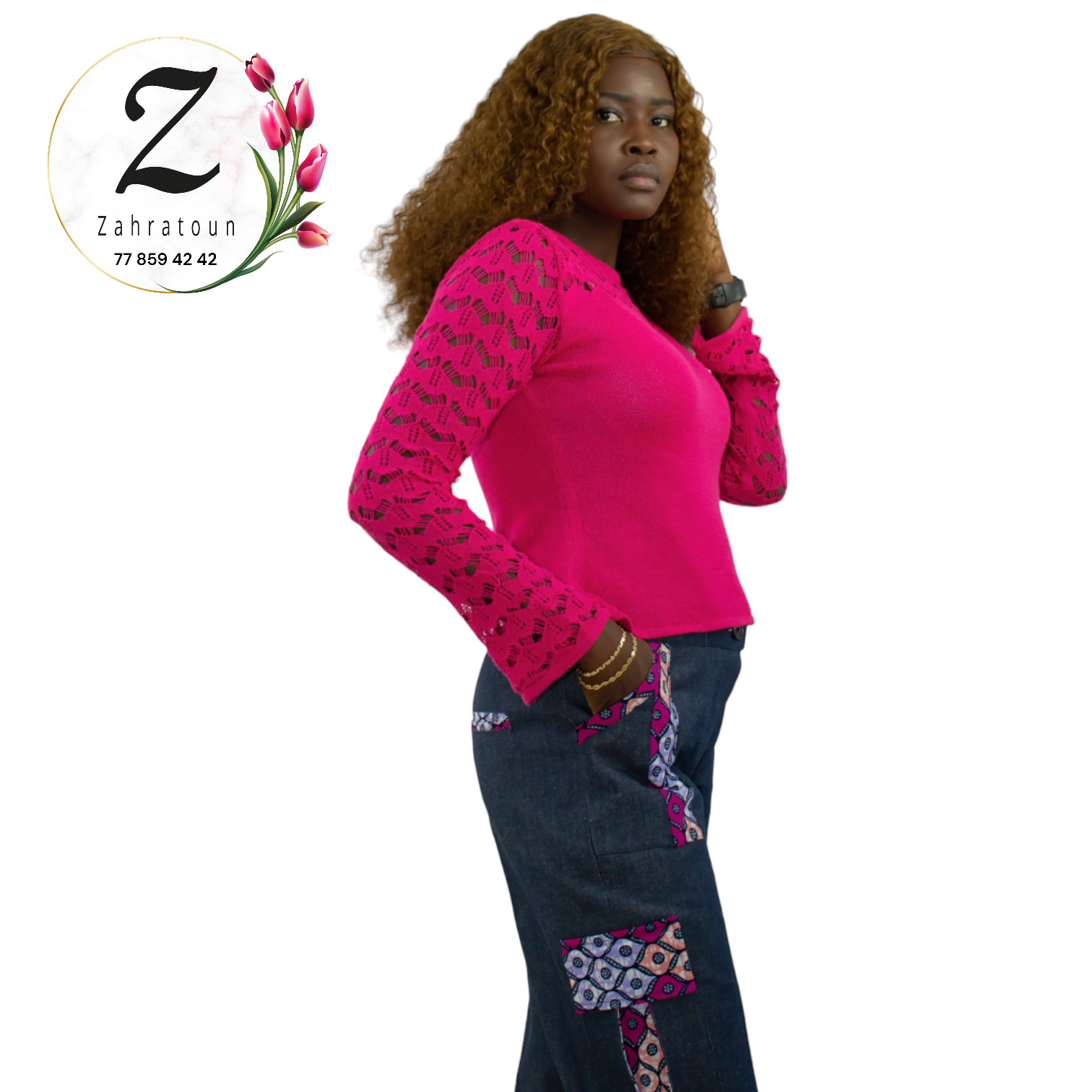 Le Pantalon Cargot  jean et wax rose: Préparez-vous à conquérir votre journée avec style et fonctionnalité grâce à notre pantalon cargo tendance. Parfait pour la femme moderne en mouvement, ce pantalon associe la praticité du design cargo à une esthétique urbaine et épurée.